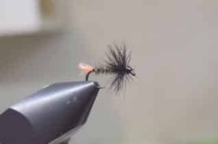 enrouler une dernière plume de marabout blanche, former la tête avec la soie de montage, couper et voila votre mouche est pratiquement terminée.